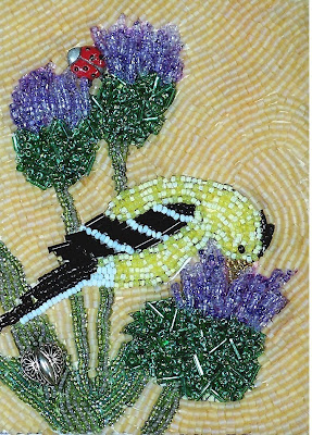 Everyone knows that if daffodils had wings they'd be goldfinches... Since my bird garden is festooned with daffodils in April it's only fitting that my April BJP be a goldfinch. The color is off in this photo.... The background beads are actually an iridescent peach but try as I might I couldn't get it or adjust it.....I know that without this project I would have NEVER gotten around to documenting the development of my garden for the birds and how it changed my life... My first plan was to use part of the story with each finished bird but now thinking I'm going to use the birds for a cover for a book about the garden... Then I will make copies for kids and grandkids...