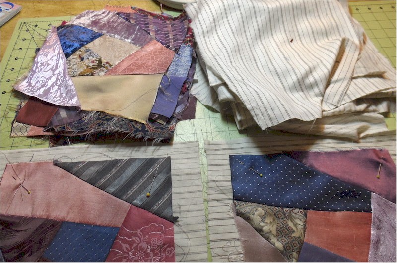 Until I had them all out... Then I stepped back and tweeked a few here and there. I try to balance out color, value, and patterns at this point...I'm not too fussy. I had a lot of patches from paisley ties and I wanted some on each block.. This goes VERY fast because I try to not overthink this at this point... Any goofs I make at this point can be dealt with when I start embellishing.